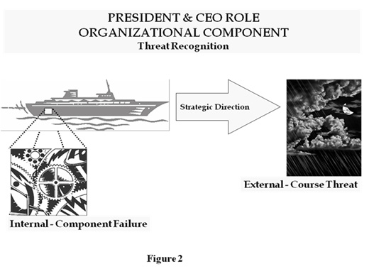 Figure 2 below depicts the President/CEO responsibility to be able to recognize storms or threats that can harm the company ship while at the same time ensuring that the various systems that drive the ship are all running efficiently. Many CEOs, Presidents and VP GMs spend too much time looking inwardly at short term issues within their organization and not enough time looking outwardly scanning for opportunities and threats in the longer term. An example of an internal component failure is the accounting fraud that was purported to have occurred at Nortel. This has cost Nortel millions plus the erosion of confidence with clients and shareholders. Nortel is still struggling to recover.